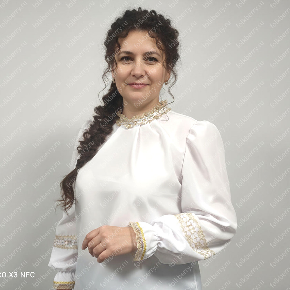 Блуза выполнена из белого шифона. Пышный рукав, по запястью волан. Декор золотистого или серебристого цвета.Для правильного размера напишите, пож-та, Ваш рост, окружность груди, ширину плеча и длину рукава.