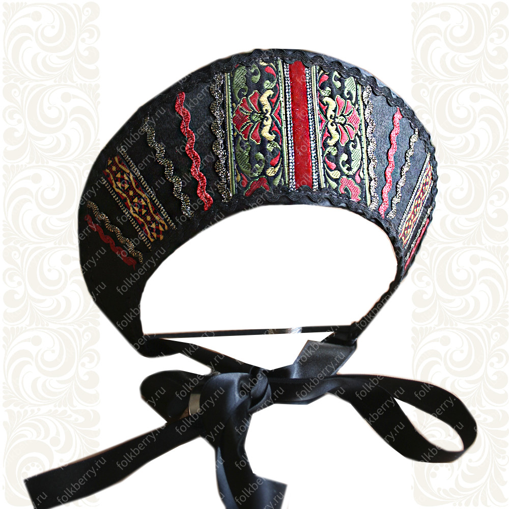 Выполнен на твёрдой основе, ткань – атлас, декорирован тесьмой «завиток», "вьюнок", жаккардовой тесьмой.