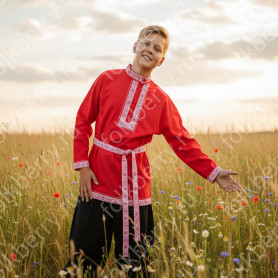 Выполненный в православном стиле сарафан с блузой «Костюм Воронежский» сшит из натурального хлопка в цветочек. Модель скромно декорирована однотонным воланом в цвет с основной тканью и тесьмой вьюнок. Можно носить под пояс и регулировать бретели по длине. Белая блузка из хлопка с длинным рукавом расшита натуральным нежным кружевом.