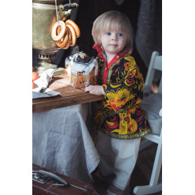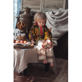 Косоворотка Оберег - выполнена из льна белого цвета, украшена жаккардовой лентой шириной 3 см синего цвета. Косоворотка смотрится стильно и современно, сочетается с современными элементами одежды, хотя содержит в себе элементы традиционного кроя и орнамента. В комплект входит пояс-кушак.