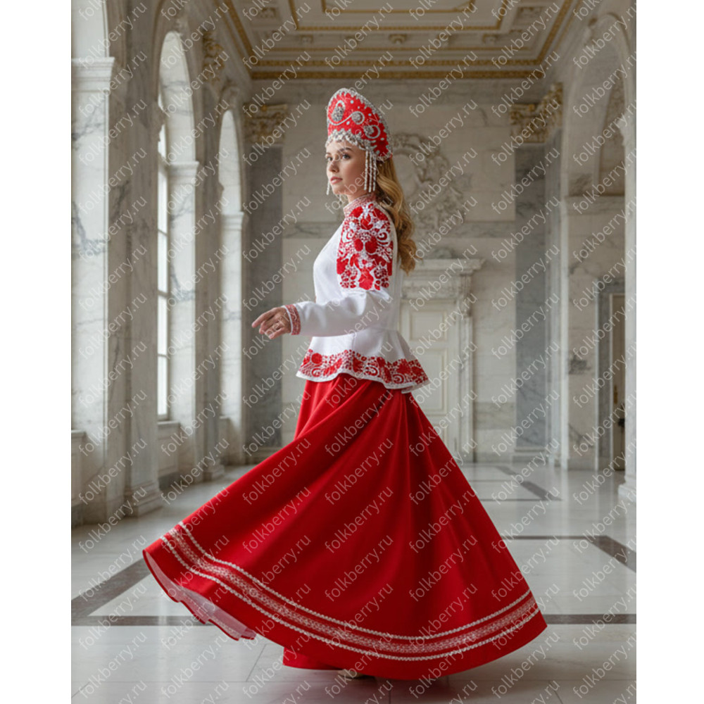 Костюм  выполнен из габардина и красиво подобранного декора в золотистых цветах. Достоинства габардина  в том, что он не мнется, не блестит, как атлас, ложится красивыми  мягкими складками, цвет не выгорает. Юбка  с оборкой, декор в золотистых цветах, по талии на  двойной резинке. Блуза  белого праздничного цвета, с баской,  рукава расширены внизу, с манжетами.   Сзади на блузе шнуровка. Она дает хорошую посадку по фигуре. Костюм предназначен для творческих  сольных и коллективных театральных выступлений.