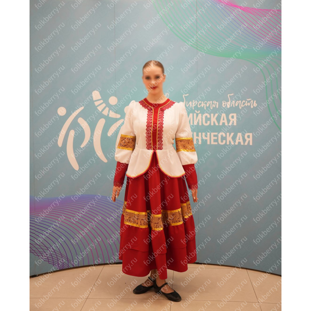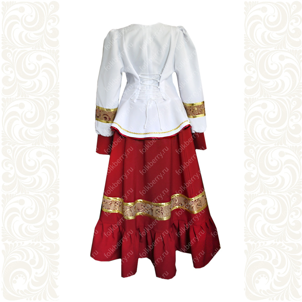 Костюм  выполнен из габардина и красиво подобранного декора в золотистых цветах. Достоинства габардина  в том, что он не мнется, не блестит, как атлас, ложится красивыми  мягкими складками, цвет не выгорает. Юбка  с оборкой, декор в золотистых цветах, по талии на  двойной резинке. Блуза  белого праздничного цвета, с баской,  рукава расширены внизу, с манжетами.   Сзади на блузе шнуровка. Она дает хорошую посадку по фигуре. Костюм предназначен для творческих  сольных и коллективных театральных выступлений.