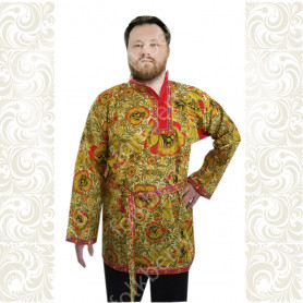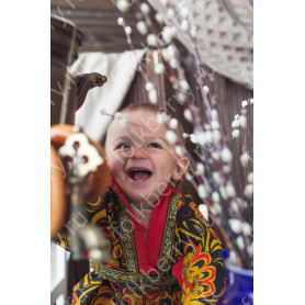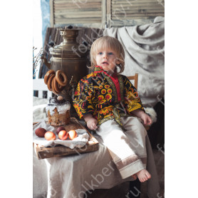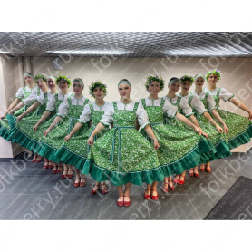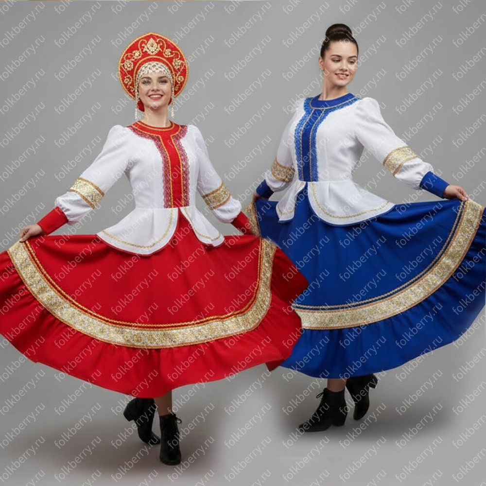 Костюм выполнен из габардина и красиво подобранного декора в золотистых цветах. Достоинства габардина в том, что он не мнется, не блестит, как атлас, ложится красивыми мягкими складками, цвет не выгорает. Юбка с оборкой, декор в золотистых цветах, по талии на двойной резинке. Блуза белого праздничного цвета, с баской, рукава расширены внизу, с манжетами. Сзади на блузе шнуровка. Она дает хорошую посадку по фигуре. Костюм предназначен для творческих сольных и коллективных театральных выступлений.