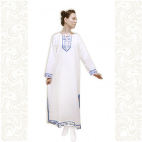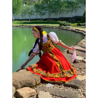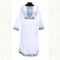 Декор платья - жаккардовая тесьма со славянскими символами. Талия немного завышена, пояс в комплекте.
