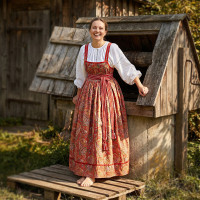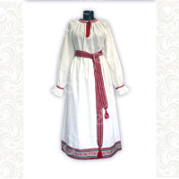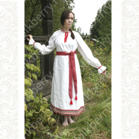 Платье «Солдатка» отрезное по талии, рукав реглан, юбка-почти солнце, длиной немного ниже колена. В комплект входит пояс. Важно, что декор платья выдержан в славянском стиле. Это платье - современное прочтение народных традиций. Женственное, удобное и нарядное, оно дарит ощущение радости и праздника. По стилю замечательно подходит для тематических праздников в детских  учебных заведениях, по фасону и яркости цветов отлично подойдет для танцевальных коллективов.  как правило, дети не стесняются надевать его ( в отличии от длинного русского сарафана ) Платье выполнено из немнущейся, матовой ткани "габардин" символичных для славян цветов ( красного, синего, зеленого, бордового).