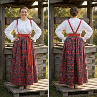 Платье «Солдатка» отрезное по талии, рукав реглан, юбка-почти солнце, длиной немного ниже колена. В комплект входит пояс. Важно, что декор платья выдержан в славянском стиле. Это платье - современное прочтение народных традиций. Женственное, удобное и нарядное, оно дарит ощущение радости и праздника. По стилю замечательно подходит для тематических праздников в детских учебных заведениях, по фасону и яркости цветов отлично подойдет для танцевальных коллективов. как правило, дети не стесняются надевать его ( в отличии от длинного русского сарафана ) Платье выполнено из немнущейся, матовой ткани "габардин" символичных для славян цветов ( красного, синего, зеленого, бордового).