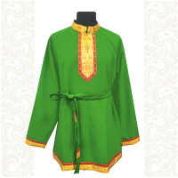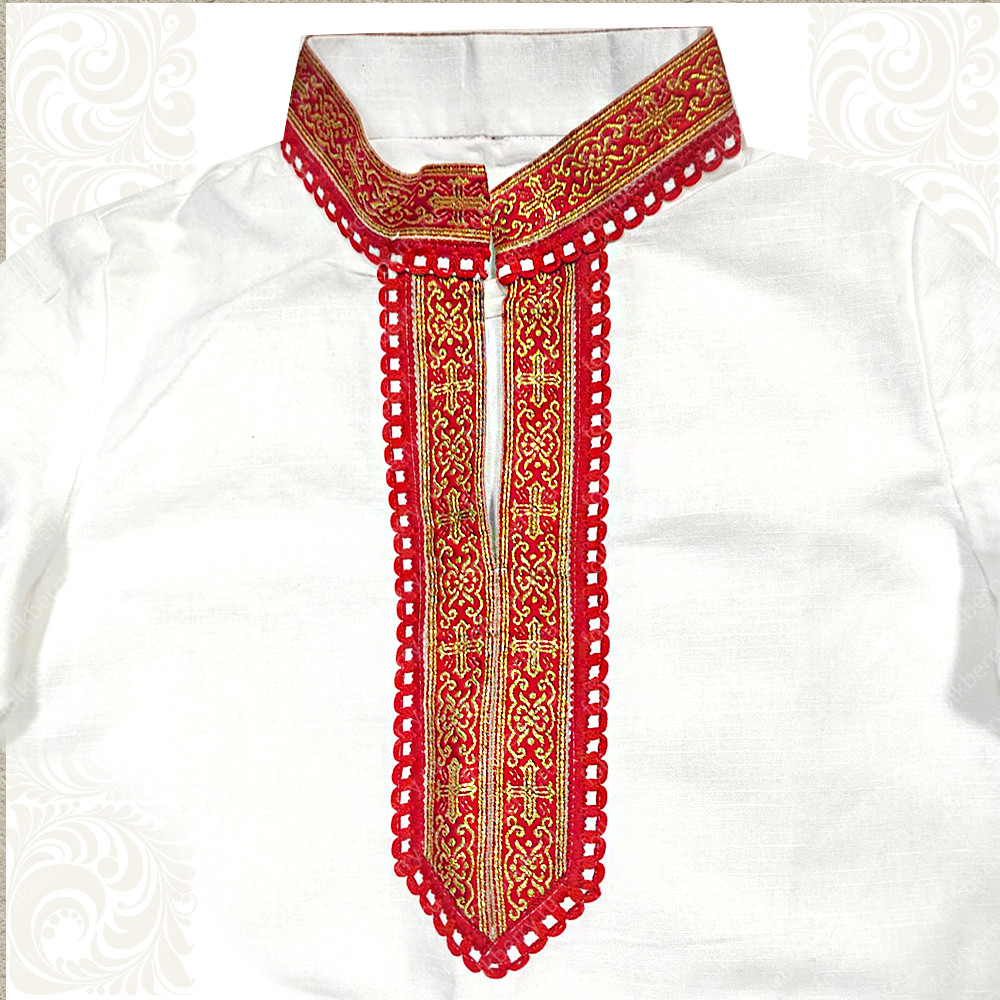 Мужская рубаха «Обряд» выполнена из белого льна, имеет втачной длинный рукав. По низу изделия, вороту и рукавам расположена жаккардовая золоченая тесьма с символами Христианства и воротником-стойкой. Дополняет рубаху кушак (пояс) из ткани с тесьмой.