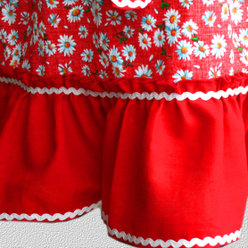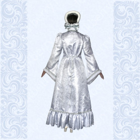 Сарафан сшит из хлопка ( большие размеры из габардина) светло-голубого цвета. Длина – 130 см, бретели регулируются. Наряд украшен жаккардовой тесьмой и «вьюнком».