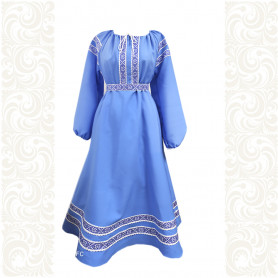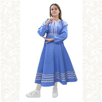 Сарафан с блузой – яркий наряд в духе народных традиций. Оригинальный дизайн, красивые оттенки синего, бирюзового, белого цветов, качественное исполнение комплекта порадуют Вас. Это хороший выбор для участников танцевально-театральных коллективов.