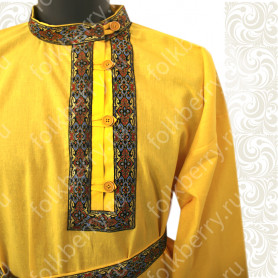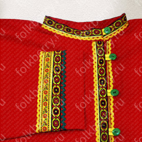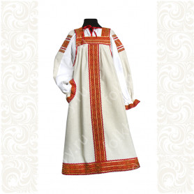Сарафан выполнен из плотного, габардина. Красивая посадка, к низу расклешен. Бретели регулируются. Главное украшение сарафана – широкий декор внизу, выполненный из жаккардовой тесьмы разной ширины и цвета, из золотистого шнура, тесьмы вьюнок и кружева. Все элементы идеально подобраны по цвету и создают красивый ансамбль.