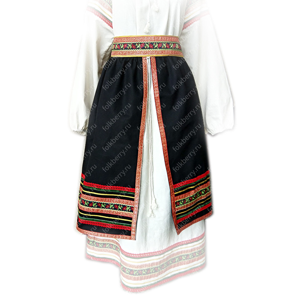 Юбка-понева состоит из трех прямоугольников, собранных на общем поясе или шнуре. Юбка красиво украшена декоративной тесьмой, тщательно подобранной дизайнером (с рисунком Маки, вьюнками разного цвета, бархатной тесьмой)