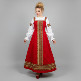 Костюм  выполнен из габардина и красиво подобранного декора в золотистых цветах. Достоинства габардина  в том, что он не мнется, не блестит, как атлас, ложится красивыми  мягкими складками, цвет не выгорает. Юбка  с оборкой, декор в золотистых цветах, по талии на  двойной резинке. Блуза  белого праздничного цвета, с баской,  рукава расширены внизу, с манжетами.   Сзади на блузе шнуровка. Она дает хорошую посадку по фигуре. Костюм предназначен для творческих  сольных и коллективных театральных выступлений.
